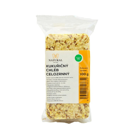 Natural puffasztott kukoricakenyér 100 g Közvetlen fogyasztásra alkalmas teljes kiőrlésű puffasztott kukoricakenyér. Összetevők: kukorica 99%, étkezési só, szójalecitin. Allergének: szója