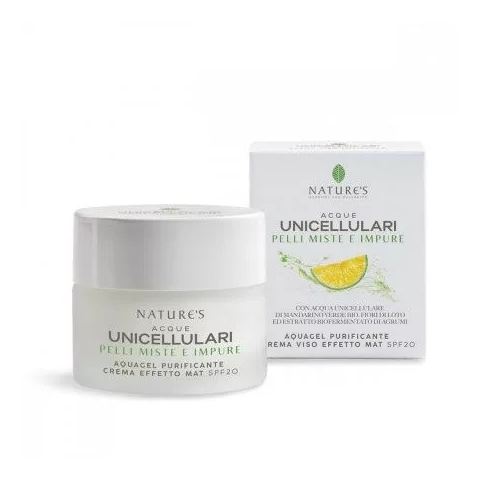 Nature's tisztító hatású gélkrém SPF20, 50 ml - Matt gélkrém - Könnyű és bársonyos, kiegyensúlyozó hatást fejt ki a bőrhibák és a tisztátalan bőr ellen - Frissítő és összehúzó hatású bio unicelluláris zöldmandarin-vizet, valamint nyugtató és antioxidáns