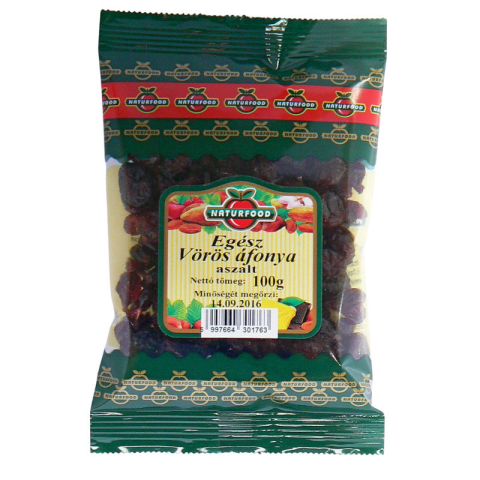 Naturfood aszalt egész vörösáfonya 100 g Fogyasztható közvetlenül csemegeként, felhasználható müzlik, joghurtok ízesítésére, sütemények készítéséhez. Összetevők: Aszalt vörös áfonya, cukor, napraforgó olaj