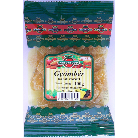 Naturfood kandírozott gyömbér 100 g Fogyasztható közvetlenül csemegeként, felhasználható müzlik, joghurtok ízesítésére, sütemények készítéséhez. Összetevők: Kandírozott gyömbér (cukor, gyömbér, antioxidáns (kén-dioxid))