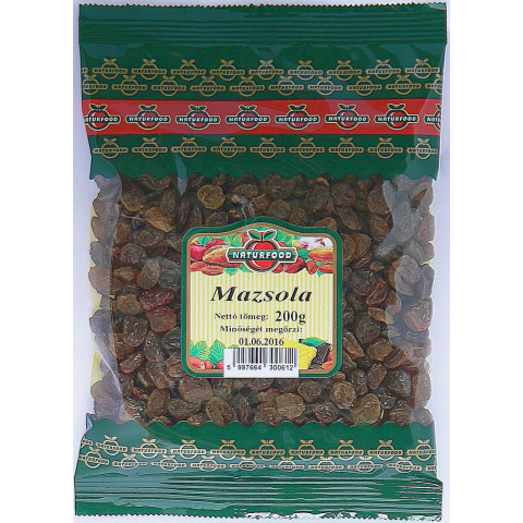 Naturfood mazsola 200 g Fogyasztható közvetlenül csemegeként, felhasználható müzlik, joghurtok ízesítésére, sütemények készítéséhez. Összetevők: Mazsola, napraforgó olaj, antioxidáns (kén-dioxid)
