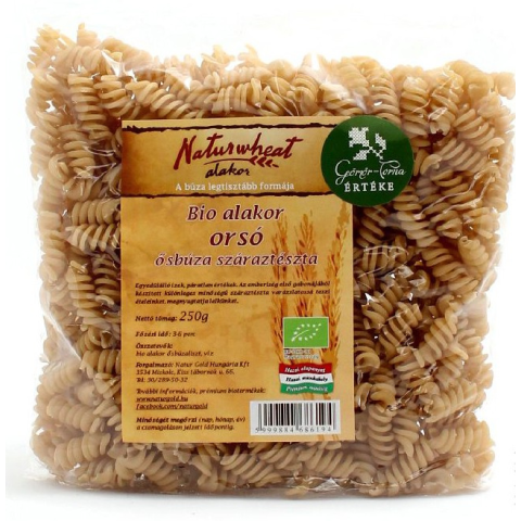 100% alakor ősbúza orsó száraztészta, a világ legtisztább búzájából. Ez az egész Európában egyedülálló termékcsaládunk tagja az orsó vagy spirál tészta. Kellemes ízű, a gabona magas karotintartalma miatt jellegzetesen sárga színű tésztakülönlegesség. T