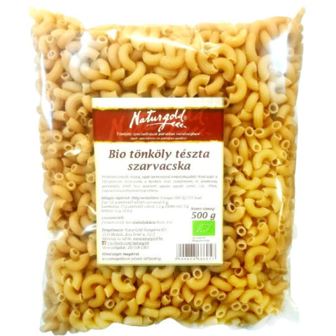 Bio tönköly tészta szarvacska Bio tönköly tészta szarvacska 500g Bio tönköly szarvacska tészta A szarvacska tészta rövid, hajlított csőtésztaféle. Főként köretként fogyasztjuk szószos húsok, raguk mellé, de paradicsomos, tejszínes feltéttel, vagy akár