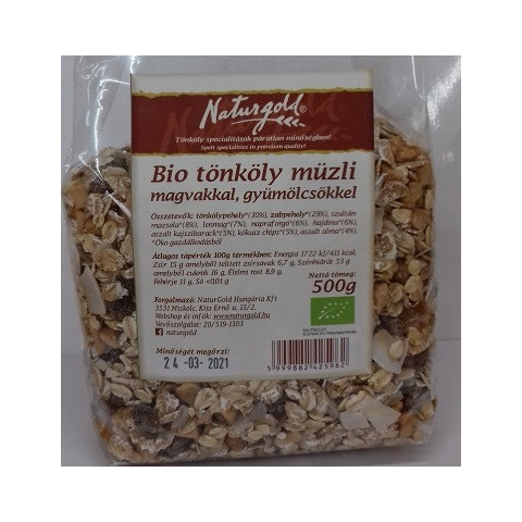 Naturgold bio tönköly müzli magvakkal, gyümölcsökkel 500 g Mostantól a gyümölcsös müzlink nem csak gabonapelyheket és aszalt gyümölcsöket, de értékes pörkölt magvakat (lenmag, hajdina, napraforgó) is tartalmazNATURGOLD BIO TÖNKÖLY MÜZLI GYÜMÖLCSÖS Telj