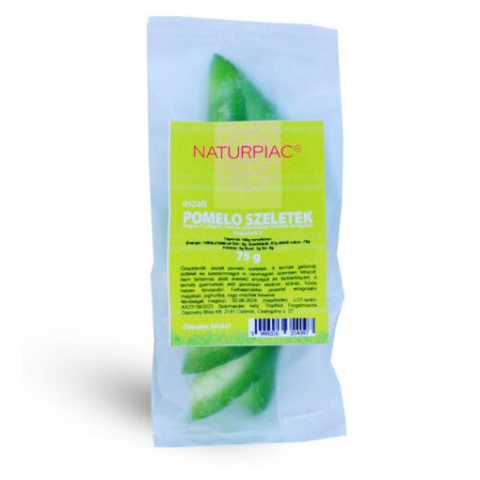 Naturpiac aszalt pomelo 75 g A Pomelo vagy pummelo egy déli gyümölcs. Halványzöldes sárgás színű. Héja vastag és szivacsos, íze édes, lágy grapefruitra hasonlít. Összetevők: aszalt pomelo szeletek, cukor, citromsav, kén-dioxid. A termék gabonát, dió