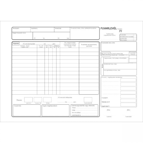 Felhasználási terület: Áruk, termékek belföldi szállításának, szállítmányozásának okmánya. 50 x 3 lapos tűzött tömb, A4, fekvő, karton borítás, 70 g/m2 önátírós (vegykezelt) belívek. Fehér alapon példányonként eltérő színű nyomat. Katalóguskód: 14540