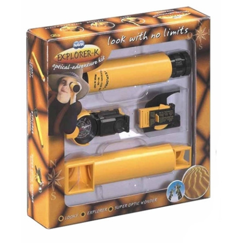 A Navir márkájú kaland és a felfedező készlet tartalmaz egy 15x-rös nagyítású távcsövet, egy Looky bővíthető periszkópot és a 10 féle funkciójú Super Optic Wonder-t. Felfedezőcsomag - Kit-ExplorerTartalmaz egy 15x-rös nagyítású távcsövet, egy Looky bőv