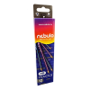 12 db ceruza van egy dobozban, 6 db kék csíkos és 6 db lila csíkos, vonalkóddal ellátva.