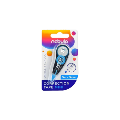 Nebuló hibajavító Mini roller 5mm széles és 5m hosszú szalaggal. Tolltartóban/táskában is könnyen elfér. Kézhez illő forma. Kiválóan fed és tapad. Azonnal felülírható. A rugalmas hegyet, és erős szalagot védőkupak óvja.