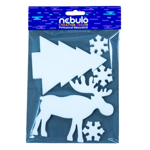 Hungarocell dekoráció NEBULO karácsonyi mix 5 darabos Polisztirolból vágott forma, amely színezhető vizesbázú festékekkel (pl, tempera, vízfesték, filctoll), továbbá díszithető ragasztóval és dekor kiegészítőkkel (pl csillámpor). Felhasználását dekorác