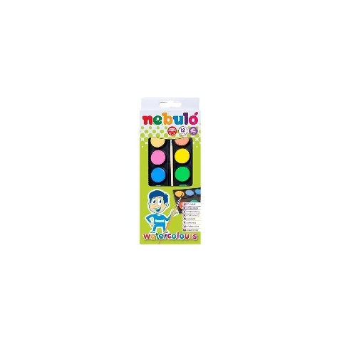 Vízfesték készlet, 12db-os, 23mm. festékgombokkal ecsettel, Nebulo kiváló választás mindennapi használatra. Megbízható, tartós és praktikus megoldás! Élénk színekkel rendelkező vízfesték készlet, fa ecsettel, praktikus müanyag dobozban. Könnyen oldódik