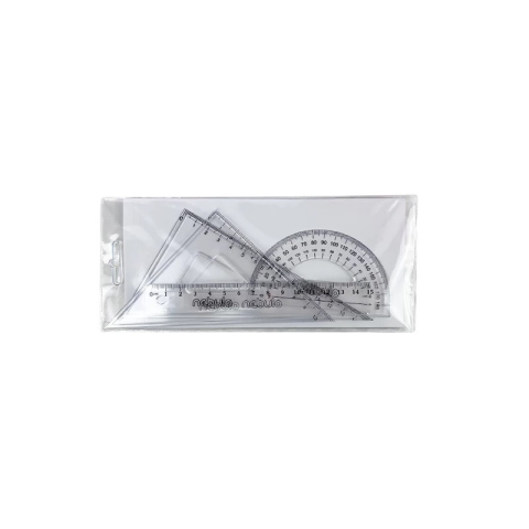 Iskolai vonalzókészlet jól olvasható számskálával. A készlet tartalma: 1 db 15 cm-es egyenes vonalzó; 1 db 60°-os, 15 cm-es számskálájú háromszög vonalzó; 1 db 45°-os, 11 cm-es számskálájú egyenlő szárú háromszög vonalzó; 1 db szögmérő.