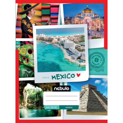 A tűzött vonalas Mexikó mintás füzet 81-32-es A/4-es méretben igazi élmény minden kalandvágyó gyerek számára! Ez a füzet nemcsak az iskolai feladatokra alkalmas, hanem arra is, hogy a tanulás során elkalandozzon a képzelet – méghozzá egyenesen Mexikó vibráló és sokszínű világába. A borítón Cancun mesés tengerpartja, a legendás Chichén Itzá piramisa, m