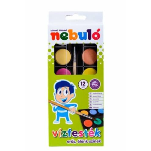 Vízfesték, 12 darabos, 28 mm, NEBULO Élénk színekkel rendelkező vízfesték készlet, fa ecsettel, praktikus müanyag dobozban. Könnyen oldódik és egyenletesen fed.