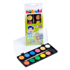 A magas pigment tartalomnak köszönhetően élénk színekkel rendelkező 12 színes vízfesték készlet, jó minőségű fa ecsettel. A festék könnyen oldódik és egyenletes fedést biztosít. A praktikus, könnyen zárható műanyag dobozban a festékkorongok jól elkülönülnek, így használat esetén kisebb a lehetősége a különböző színek véletlenszerű keveredésének.