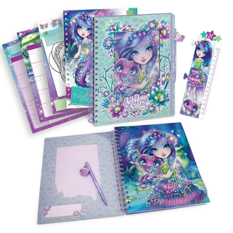 Gyönyörű határidőnapló matricákkal, vonalzóval, és tollal a Nebulous Stars egyik csillaglányával, Nenuphia-val.