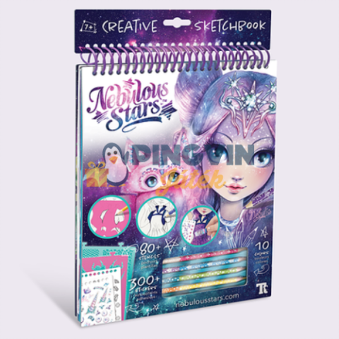 Csodaszép kreatív foglalkoztató füzet - Nebulia világa A füzet mérete: kb. 29,5 x 22 cm A készlet tartalma: 35 oldalas spirálos vázlatfüzet 2 db sablon több mint 80 mintával 3 db átsatírozható minta 300+ db matrica 5 db kétvégű ceruza (10 féle szín) 8 fél