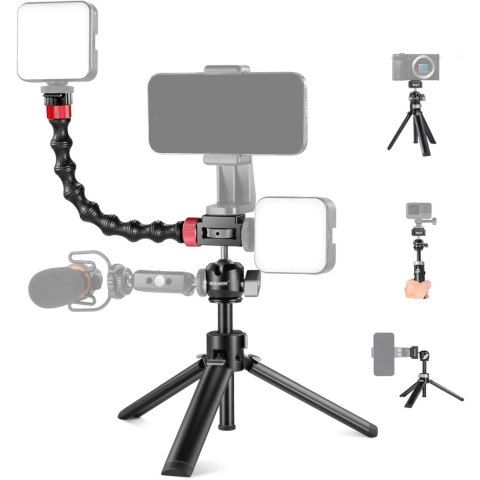 NEEWER Fém asztali mini állvány két csatlakozóval A NEEWER fém asztali mini állvány két csatlakozóval egy kiváló megoldás a kreatív felhasználók számára, akik mobilitást és sokoldalúságot keresnek. A gömbfej és hajlékony csőkar kombinációja lehetővé teszi