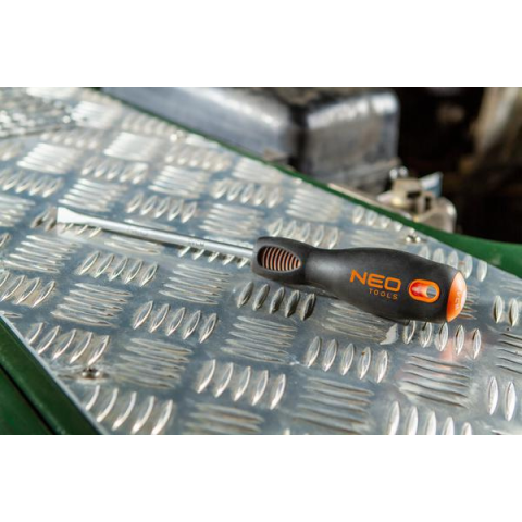 NEO lapos csavarhúzó. A csavarhúzó szára kivételesen ellenálló S2. A csavarhúzó hegy hőkezelésnek lett alávetve, így megfelelő, 56 HRC keménységet és hajlítószilárdságot ért el. A csavarhúzó hegye mágneses. A markolat három élű hasáb alakja a kialakított