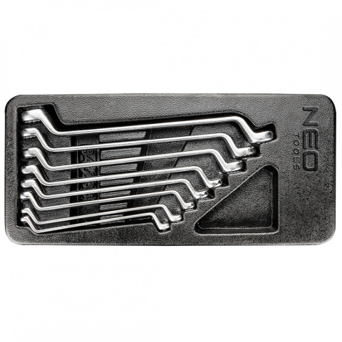 Neo Csillag kulcs készlet, hajlított (Ref.sz. 84-233) 8 db normális méretű kulcsot tartalmaz (6 - 22 mm), a DIN 838 szabvány szerint készült. A kimagasló minőségű króm-vanádium acél biztosítja a kulcsok sokéves tartósságát. A szerszámok praktikus, a Neo 8