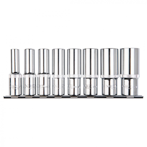 Spline ½ feltét, hosszú, 8 db-os készlet, szferikus, illeszkedik úgy a colos, mint a metrikus hatlapú, tizenkétlapú, négylapú, Torx és Spline csavarfejekre, CrV acél, méretek: 10 mm, 12 mm, 13 mm, 15 mm, 17 mm, 19 mm, 22 mm, 24 mm