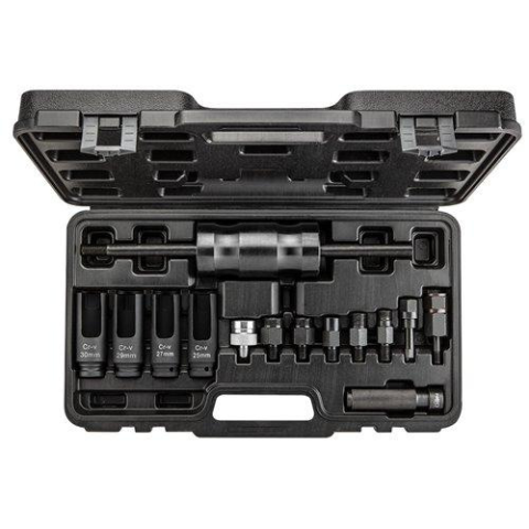 Dízel befecskendezőfej kihúzó készlet, Tartalma:, Csúszó kalapács 3,8 kg, vezetőtengely 400 mm, Hatszögletű csatlakozók:: 25, 27, 29, 30 x 100 mm , Injektor adapterek:, M14 x 1.5 - Delphi,, M17 x 1, M27 x 1 - Bosch, M20 x 1 - Denso,, M24 x 1, M27 x 1 -