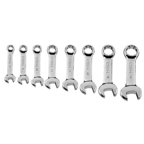Csillag-villáskulcs készlet, rövid, 8 db?os, 8-19 mm, méretek: 8 mm, 9 mm, 10 mm, 12 mm, 13 mm, 14 mm, 17 mm, 19 mm, CrV acél, DIN 3113 NEO rövid csillag-villáskulcs készlet 8 db kulccsal, a népszerű 8 mm - 19 mm közötti méretekben, a DIN 3113 s