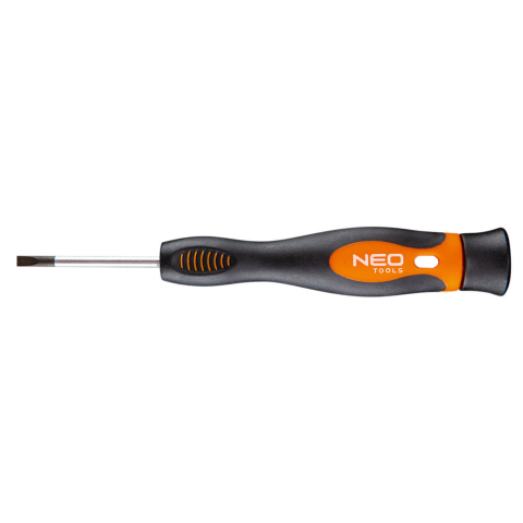 NEO lapos műszerész csavarhúzó. A csavarhúzó szára kivételesen ellenálló S2 acélból készül. A csavarhúzó hegy hőkezelésnek lett alávetve, így megfelelő keménységet és hajlítószilárdságot ért el. A csavarhúzó hegye mágneses. A markolat forgó kupakja megkön