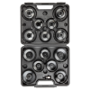 NEO 11-243 Olajszűrő dugókulcs készlet, 16 db-os. Professzionális műhelyek és autószervizek, valamint haladó amatőrök számára. Kehely szerkezetű dugókulcs-készlet. Az autók fém olajszűrőinek szerelésére szolgál. A kulcsok mellett a készlet tartalmaz egy 3