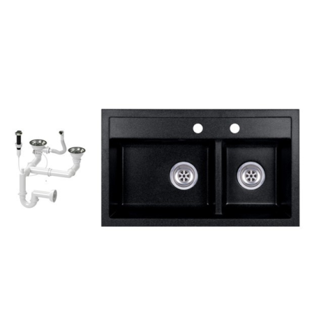 1 kép Nero Evinion Double I74-44C Fekete Gránit Mosogató + Dugóemelő (fekete)