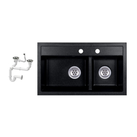 1 kép Nero Evinion Double I74-44C Fekete Gránit Mosogató + Szifon készlet (fekete)