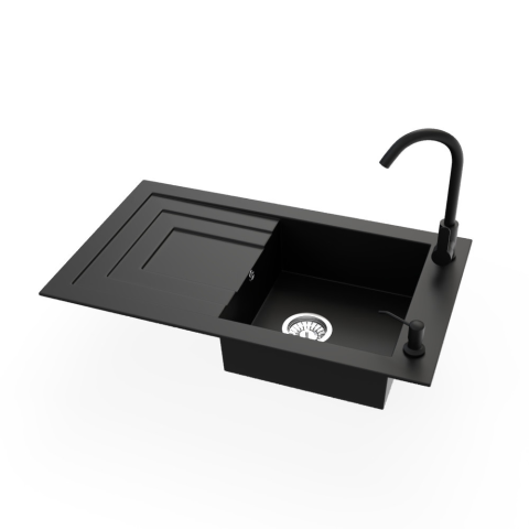 Nero Gránit mosogató NERO Cortina + magasított csaptelep + adagoló (fekete matt) mosogatótálca termékleírás