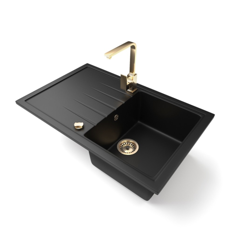 1 kép Nero Gránit mosogató NERO Eris + Design Gold csaptelep + dugókiemelő (matt fekete)