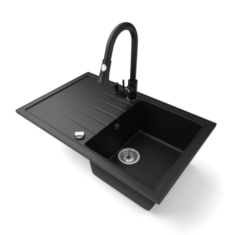 Nero Gránit mosogató NERO Eris + kihúzható zuhanyfejes Snake csaptelep + adagoló + dugókiemelő (matt fekete) mosogatótálca termékleírás