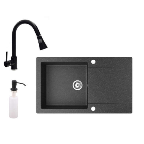Nero Gránit mosogató NERO Gold + kihúzható zuhanyfejes Snake csaptelep + adagoló (fekete) mosogatótálca termékleírás
