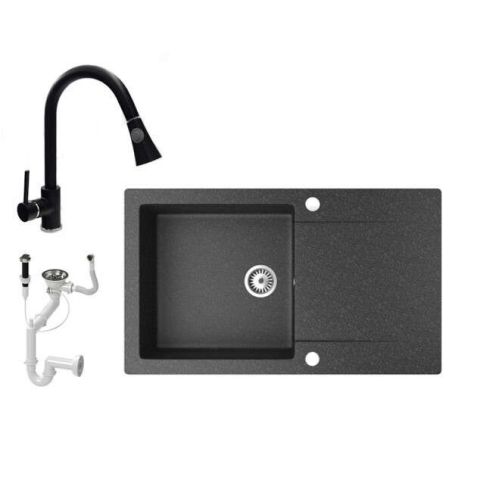 1 kép Nero Gránit mosogató NERO Gold + kihúzható zuhanyfejes Snake csaptelep + dugókiemelő (fekete)