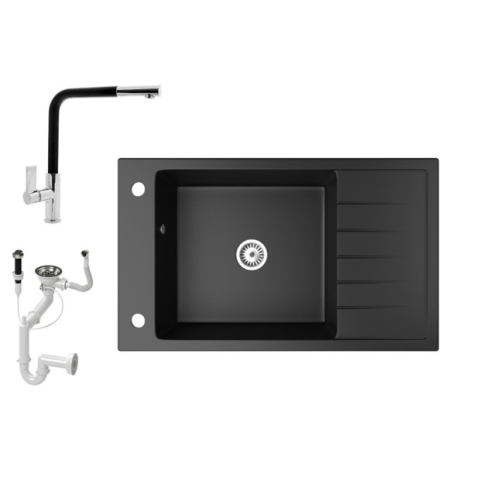 Nero Gránit mosogató NERO Grande + kihúzható Linea csaptelep + dugókiemelő (matt fekete) mosogatótálca termékleírás