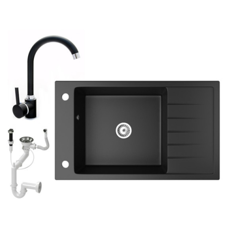 1 kép Nero Gránit mosogató NERO Grande + magasított csaptelep + dugókiemelő (matt fekete)