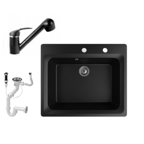 1 kép Nero Gránit mosogató NERO Italia + kihúzható Shower csaptelep + dugóemelő (matt fekete)