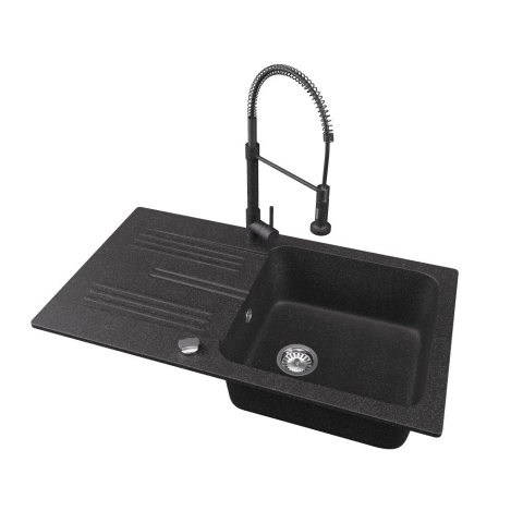 Nero Gránit mosogató NERO Malta + kihúzható zuhanyfejes Loop Spiral csaptelep + dugóemelő (fekete) mosogatótálca termékleírás