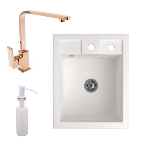 1 kép Nero Gránit Mosogató NERO Parma + Design Rose-Gold csaptelep + adagoló + szifon (fehér)