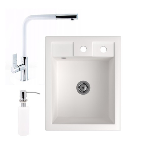 1 kép Nero Gránit Mosogató NERO Parma + kihúzható fejes Linea csaptelep + adagoló + szifon (fehér)