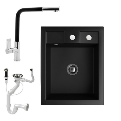 1 kép Nero Gránit Mosogató NERO Parma + kihúzható fejes Linea csaptelep + dugókiemelő + szifon (matt fekete)