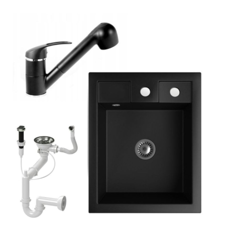 1 kép Nero Gránit Mosogató NERO Parma + kihúzható zuhanyfejes Shower csaptelep + dugókiemelő + szifon (matt fekete)