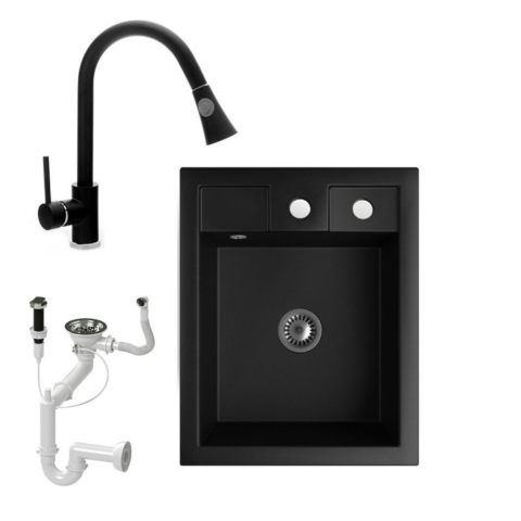 1 kép Nero Gránit Mosogató NERO Parma + kihúzható zuhanyfejes Snake csaptelep + dugókiemelő + szifon (matt fekete)