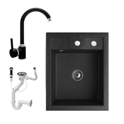 1 kép Nero Gránit mosogató NERO Parma + magasított csaptelep + dugókiemelő + szifon (fekete)