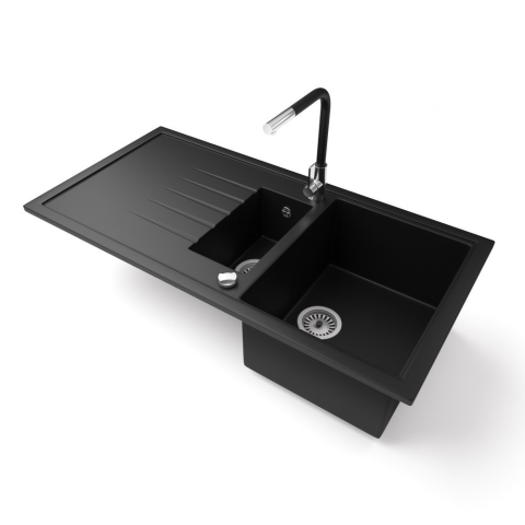 1 kép Nero Gránit mosogató - Nero Solarys + kihúzható Linea csaptelep + dugókiemelő (matt fekete)