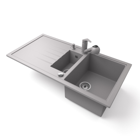 Nero Gránit mosogató - Nero Solarys + kihúzható zuhanyfejes Shower csaptelep + adagoló + dugókiemelő (szürke) mosogatótálca termékleírás
