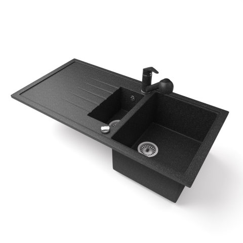 Nero Gránit mosogató - Nero Solarys + kihúzható zuhanyfejes Shower csaptelep + dugókiemelő (fekete) mosogatótálca termékleírás
