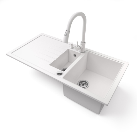 Nero Gránit mosogató - Nero Solarys + kihúzható zuhanyfejes Snake csaptelep + adagoló + dugókiemelő (fehér) mosogatótálca termékleírás